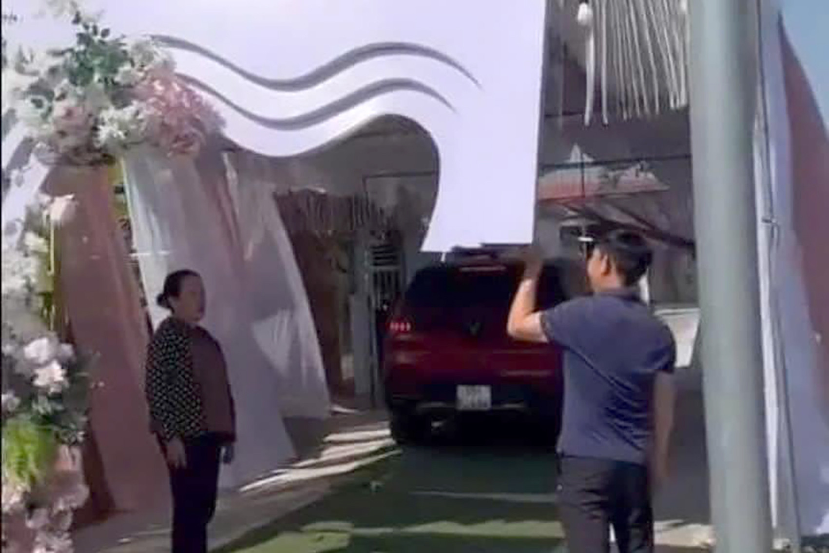 Chiều cùng ngày, khi gia đình chị L. đang chờ đơn vị cho thuê rạp cưới tới để di chuyển rạp từ ngõ vào nhà thì ông M. một lần nữa dùng xe ô tô tông vào cổng cưới.