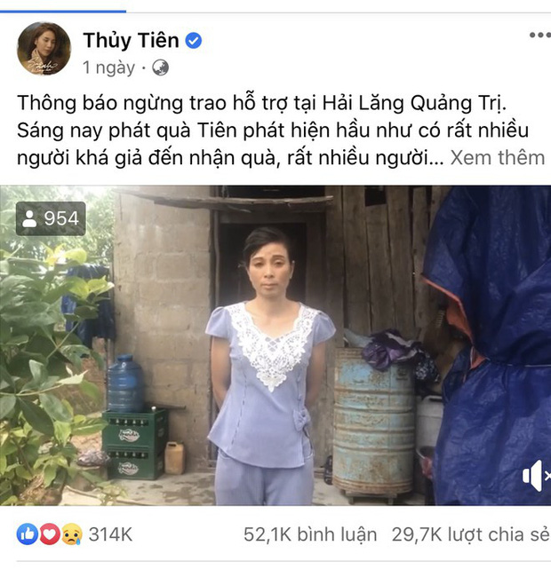 Trong đoạn clip cũng ghi lại ý kiến của ba người đàn ông tự giới thiệu là người thuộc xóm này cho biết, cả xóm có gần 130 hộ nhưng chỉ có 6 hộ được xét nhận phiếu tặng quà cứu trợ từ đoàn của Thủy Tiên, trong đó có một hộ là xóm trưởng. Thủy Tiên cho rằng điều này là bất cập nên quyết định sẽ hoãn việc phát quà cứu trợ tại 12 xã tại Hải Lăng, Quảng Trị cho đến khi cô thấy là "huyện, xã sắp xếp lại danh sách đúng người cần giúp thì sẽ quay lại".