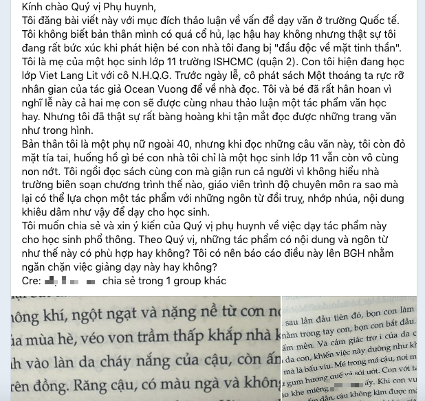 Trước đó, như Tiền Phong đã đưa tin, một phụ huynh tự nhận có con học lớp 11 tại Trường Quốc tế TPHCM (ISHCMC, TP Thủ Đức, TPHCM) chia sẻ bài đăng gây xôn xao. Chủ nhân bài đăng này cho hay, trước ngày lễ, cô giáo đã phát sách Một Thoáng Ta Rực Rỡ Ở Nhân Gian cho học sinh về nhà đọc. Khi cùng con đọc cuốn sách trên, người này bàng hoàng vì đọc được những trang văn miêu tả cảnh "giường chiếu".