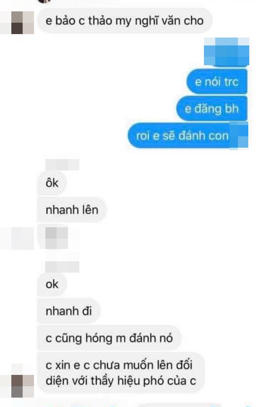 Cứ ngỡ sự việc này đã kết thúc thì mới đây cô bạn N.H.A lại tiếp tục chia sẻ tin nhắn được cho là của một số nữ sinh trong nhóm chat trên. Theo ảnh chụp màn hình tin nhắn, những nữ sinh này "tâm sự" với nhau, chỉ giả vờ xin lỗi H.A để vụ việc lắng xuống, sau đó sẽ đánh cô bạn cho bõ tức.