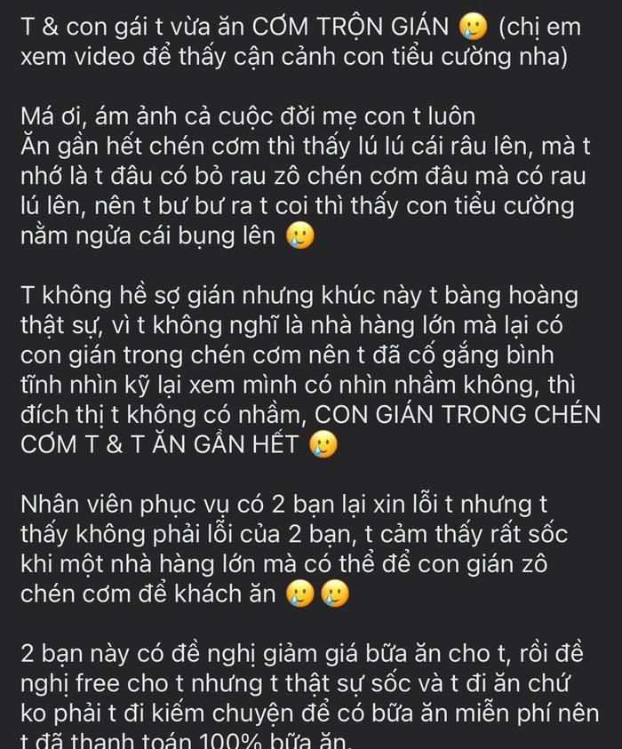 Không hề sợ gián nhưng khúc này mình bàng hoàng thật sự, vì mình không nghĩ là nhà hàng lớn như thế lại có gián trong đồ ăn. Mình cố gắng bình tĩnh và nhìn kĩ lại xem có nhầm không, thì đích thị mình không có nhầm, con gián trong chén cơm và mình ăn gần hết” – Chị V chia sẻ.