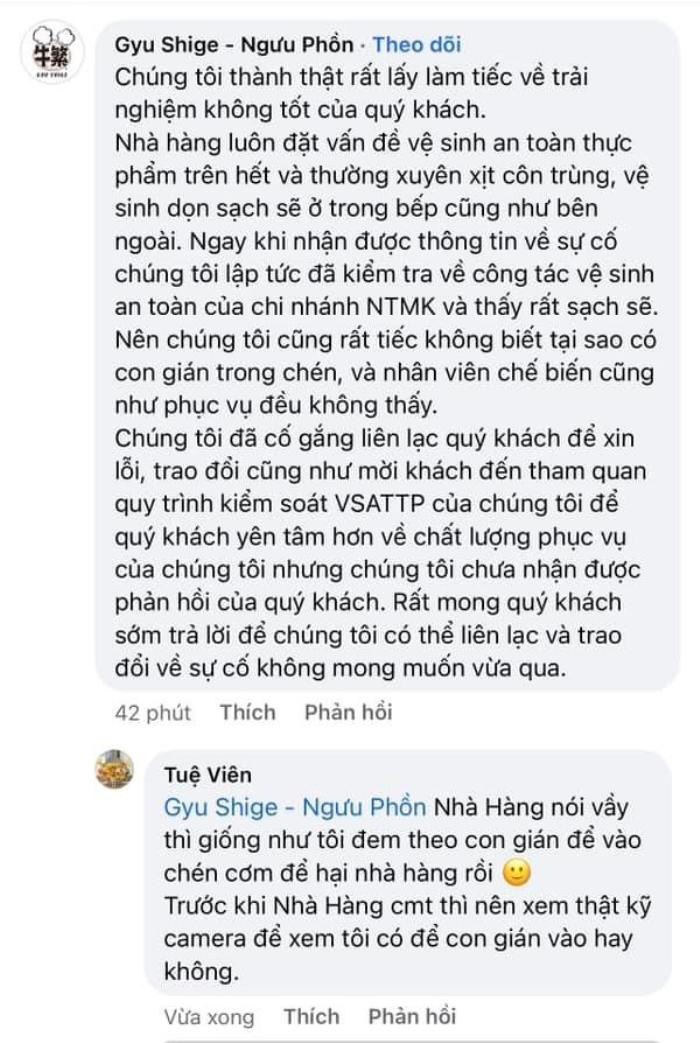Ngay khi nhận được thông tin về sự cố, chúng tôi đã lập tức kiểm tra về công tác vệ sinh an toàn thực phẩm và thấy rất sạch sẽ. Nên chúng tôi rất lấy làm tiếc không biết tại sao có con gián trong chén, và nhân viên biên chế cũng như phục vụ đều không thấy.