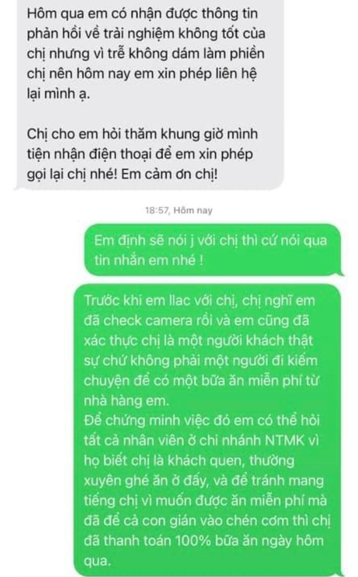 Nữ khách hàng chia sẻ: "Trước khi quyết định phản ánh sự việc lên mạng xã hội, tôi cũng đắn đo, có thể sự việc này có ảnh hưởng đến công việc của nhân viên nhà hàng. Thế nhưng, tôi nghĩ mình cần phải lên tiếng, để các bạn chú tâm hơn vào công việc, tránh xảy trường hợp như trên”.