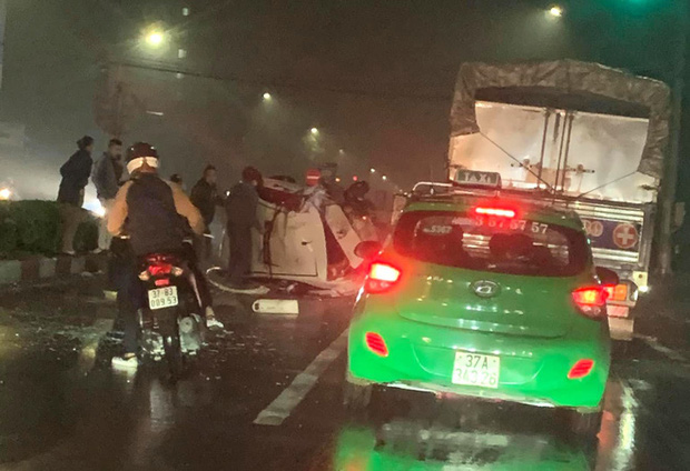 Trước đó, khoảng 23h50 tối 5/1, chiếc taxi của Hãng Vạn Xuân chở một nữ hành khách đi qua ngã tư Mai Hắc Đế - Phan Bội Châu, TP Vinh thì va chạm với xe bán tải mang kiểm soát Nghệ An. Hai xe này tiếp tục lao lên phía trước va chạm với một xe taxi khác.