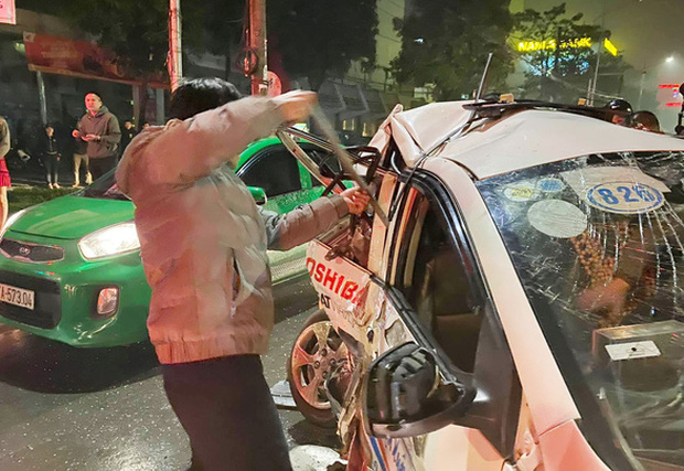Do chiếc taxi bẹp dúm nên người dân phải dùng xà beng cạy cửa đưa hai người đi cấp cứu.