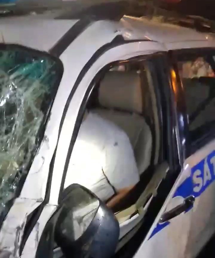 Tại hiện trường, xe ôtô gắn phù hiệu xe CSGT bị bể nát phần đầu hư hỏng nặng, tài xế ngồi trong xe mặc thường phục cũng bị thương. Người dân đã phải hỗ trợ gỡ cửa xe để đưa tài xế ra ngoài.