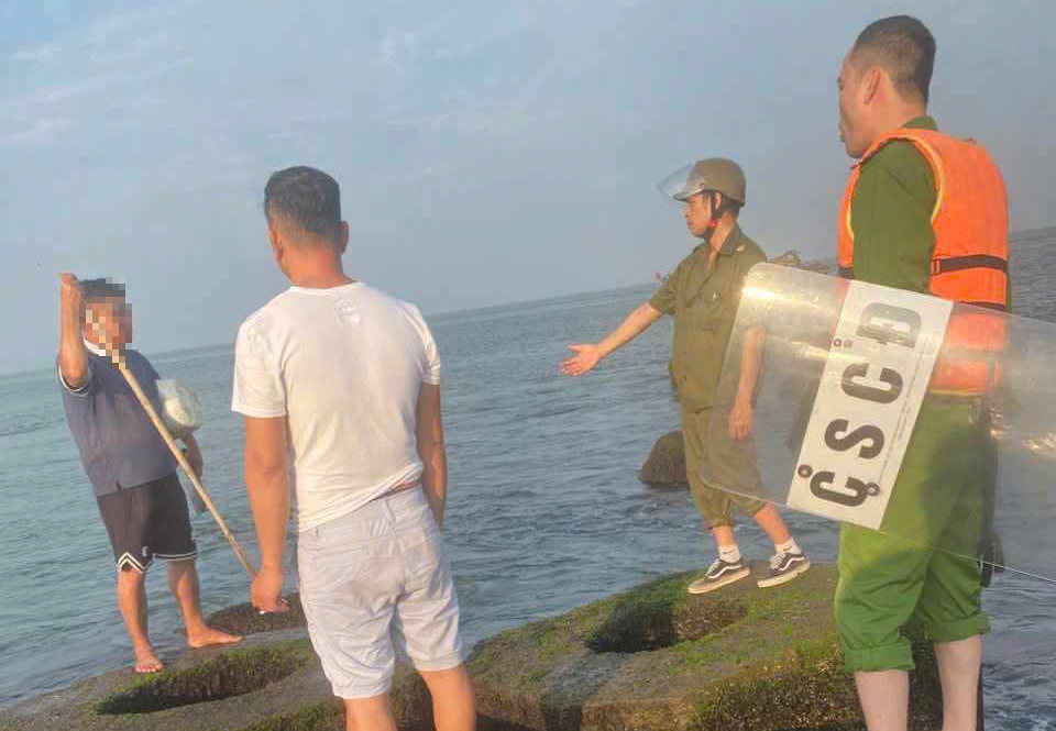 Trước đó, vào lúc 13h chiều 10/4, Công an phường Thuận An nhận được tin báo của người dân về một người đàn ông trung niên có biểu hiện không bình thường, mang theo 2 con dao ra bờ kè chắn sóng tại tổ dân phố Thai Dượng Hạ Bắc, phường Thuận An dọa tự sát.