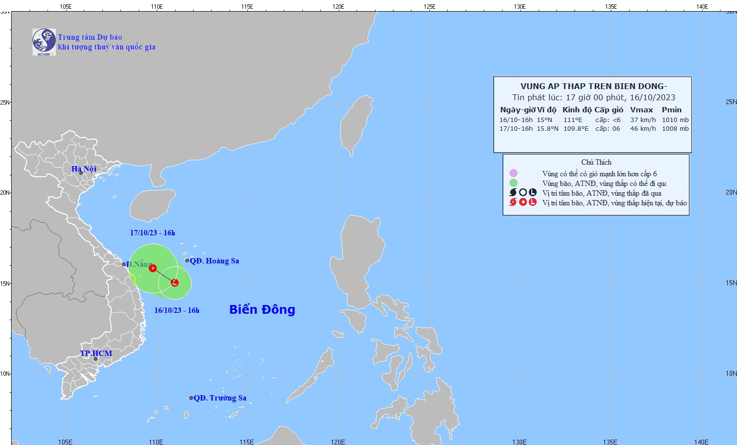 Hồi 16 giờ chiều nay (16/10), vị trí trung tâm vùng áp thấp ở vào khoảng 14,5-15,5 độ Vĩ Bắc; 110,5-111,5 độ Kinh Đông, trên vùng biển phía Tây Nam quần đảo Hoàng Sa.