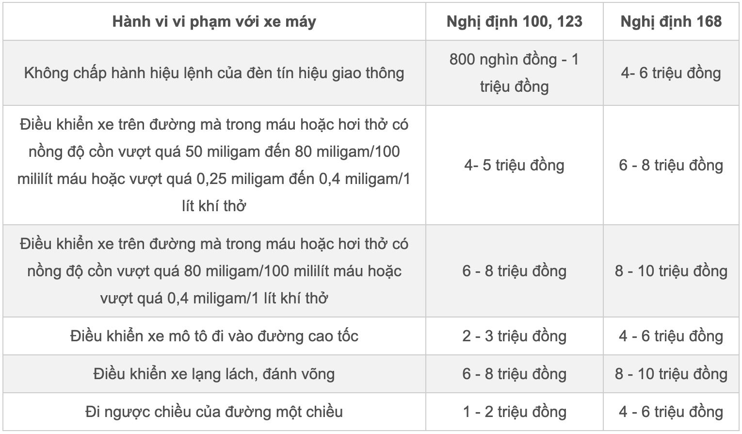 Tại nghị định này, nhiều hành vi vi phạm có mức xử phạt vi phạm hành chính tăng rất cao. Đáng chú ý, cơ quan soạn thảo đã tăng rất cao mức phạt đối với các hành vi, nhóm hành vi là nguyên nhân chính dẫn đến nhiều vụ tai nạn; đặc biệt nếu xảy ra trên đường cao tốc.