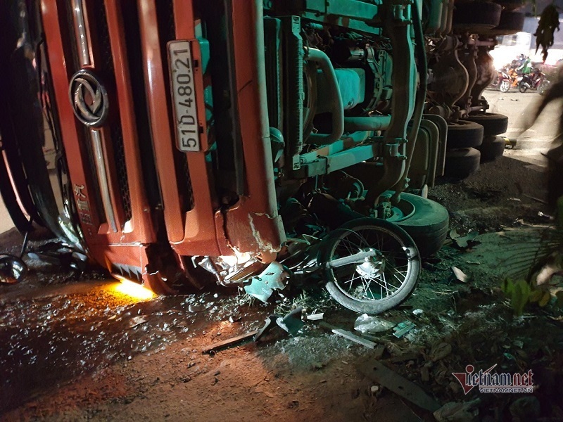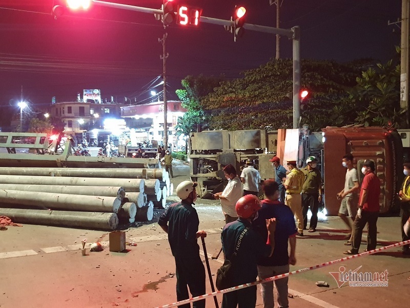 Khi đến ngã tư giao với đường Mỹ Phước – Tân Vạn thì xe máy này vượt đèn đỏ ra giữa ngã tư. Cùng lúc này, xe container biển số TP.HCM chở đầy cột điện chạy trên đường Mỹ Phước – Tân Vạn lao tới. Dù tài xế đã đánh lái để tránh nhưng do tình huống bất ngờ nên chiếc xe bị lật ngang, cột điện trên rơ mooc rơi xuống đè trúng các nạn nhân.
