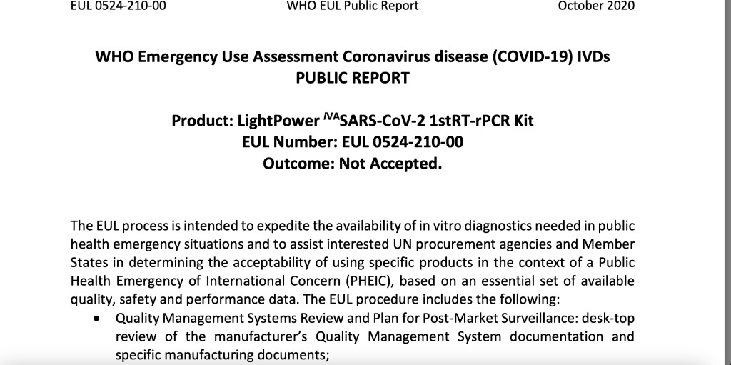 Vào khoảng tháng 4 và tháng 5-2020, một số báo chí trong nước đưa tin bộ kit xét nghiệm LightPower iVASARS-CoV-2 1stRT-rPCR Kit được WHO chấp thuận với mã số EUL 0524‐210‐00.