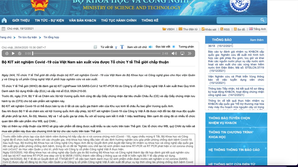 Trong khi đó, liên quan đến sản phẩm kit test này, vào thời điểm tháng 4.2020, có rất nhiều thông tin từ các cơ quan chức năng khẳng định WHO chấp thuận được sử dụng rộng rãi. Trong đó, trang web của Bộ KH-CN nhiều lần đưa tin WHO đã chấp nhận, tuy nhiên đến ngày 20-12, trên website của Bộ Khoa học và Công nghệ, thông tin công bố đánh giá của Tổ chức Y tế thế giới (WHO) và Bộ Y tế Anh cấp chứng nhận đạt chuẩn châu Âu cho bộ kit test của Công ty cổ phần Công nghệ Việt Á đã bị gỡ bỏ.
