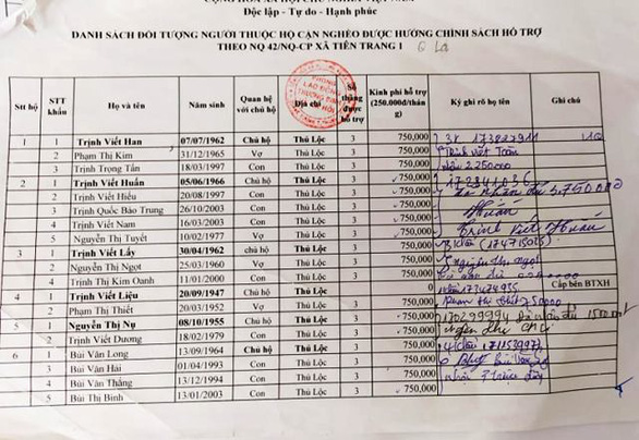 Theo bà Liên, Bùi Văn Hải là con của ông Bùi Văn L. (chủ hộ) thuộc diện hộ cận nghèo, được bình xét năm 2019. Do vợ ông L. bị bệnh hiểm nghèo nên được nhận tiền hỗ trợ 1,5 triệu đồng, 4 người còn lại gồm ông L. và 3 người con thuộc diện hộ cận nghèo, nên được nhận tiền hỗ trợ 3 triệu đồng.
