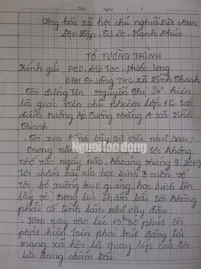 Sau khi trình bày của cô T., nhà trường đã đưa ra biểu quyết như sau: Thứ nhất, cô T. phải thừa nhận hoàn toàn sai, dù cố ý hay vô tình thì cô đã vi phạm đạo đức của nhà giáo; thứ hai, cô T. phải làm bảng tường trình sự việc trên để làm báo cáo lên Phòng Giáo dục và Đào tạo huyện Phước Long. Đồng thời nhà trường cũng triệu tập một cuộc họp trong ngày 17-10 nhằm triển khai cho toàn thể biết sự việc trên, để khi có ai hỏi thì biết mà trả lời.
