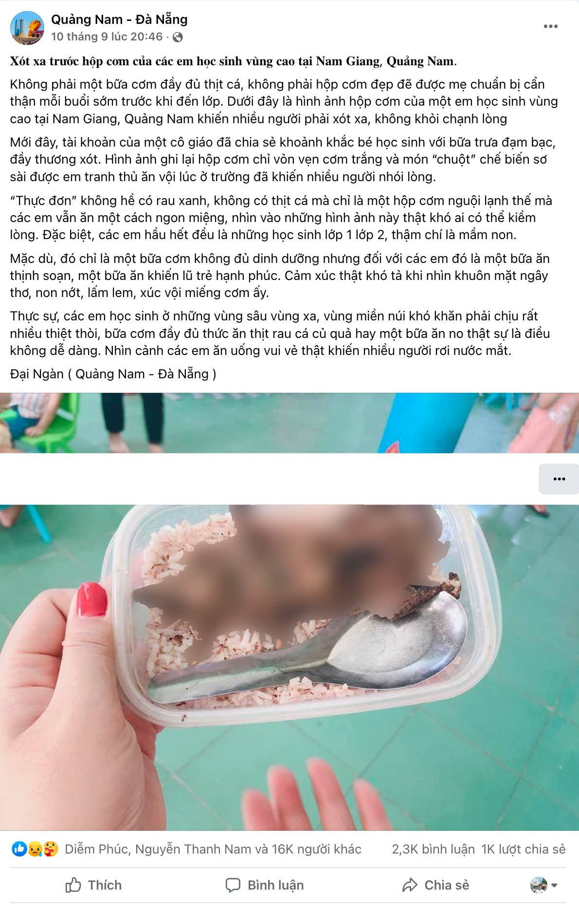 Trước đó, trên mạng xã hội đang xôn xao về dòng trạng thái có nội dung “Xót xa trước hộp cơm của các em học sinh vùng cao tại Nam Giang, Quảng Nam” kèm bức ảnh một người đang bưng tô cơm trắng với con chuột đã chế biến đặt phía trên.