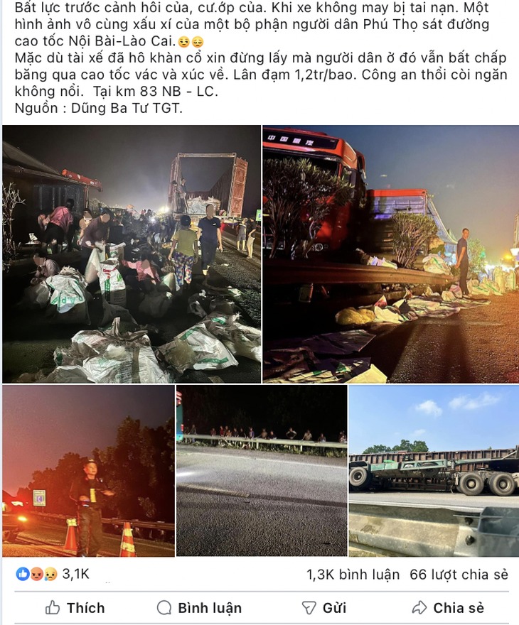 Mặc dù tài xế đã "hô khàn cổ xin đừng lấy" nhưng vẫn có rất đông người dân địa phương bất chấp băng qua đường cao tốc để vác các bao tải đựng lân, đạm về nhà. Mỗi bao lân, đạm này có giá trị 1,2 triệu đồng, theo chia sẻ từ người này đăng tải.