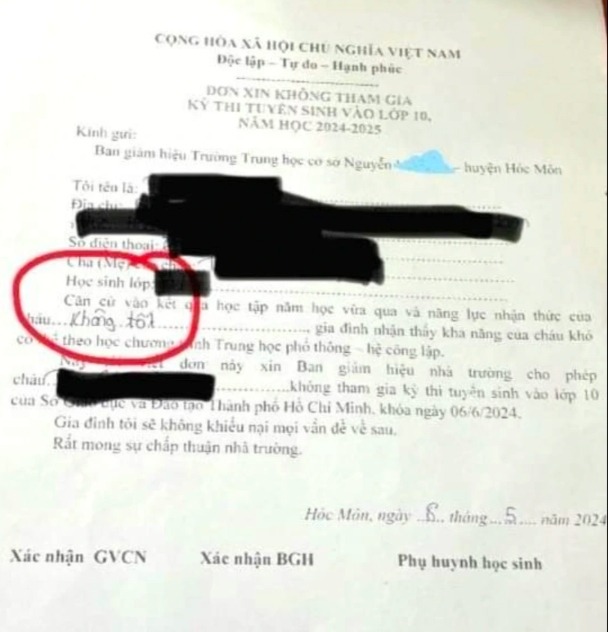 Đính kèm là tờ đơn với tiêu đề "Đơn xin không tham gia kỳ thi tuyển sinh vào lớp 10 năm học 2024-2025". Nội dung của lá đơn này có ghi sẵn lí do là "Căn cứ vào kết quả học tập năm học vừa qua và năng lực nhận thức của cháu... , gia đình nhận thấy khả năng của cháu khó có thể theo học chương trình trung học phổ thông - hệ công lập.