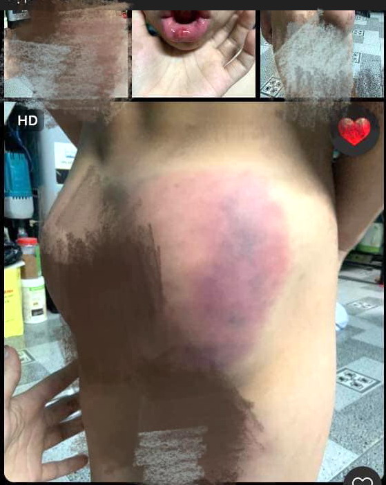 "Hôm qua lúc chở bé về, bé đòi đứng phía trước vì nói đau mông không ngồi được. Chở về đến nhà, lúc ăn cơm, tôi và chồng có thấy miệng bé chảy máu. Hỏi ra bé mới khai bị cô đánh, nghi ngờ tôi kiểm tra thân thể bé thì phát hiện phần hông, mông thâm đen, đầu bị thương, gia đình quá bức xúc. Bé nói vì không thuộc bài nên bị cô P dùng gậy gỗ đánh", chị Ph nói.