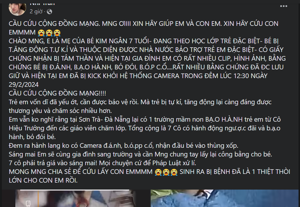 Sáng cùng ngày, mạng xã hội xuất hiện bài viết với nội dung một phụ huynh ở Đà Nẵng tố cáo sở nuôi dạy trẻ tự kỷ tại số 83, đường Tôn Quang Phiệt hành hung con của mình.