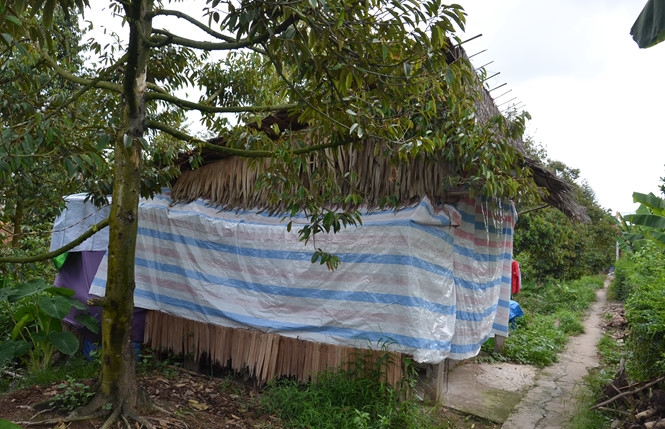 Căn nhà 16 m2 có 4 cột bằng xi măng, mái lá, vách được che tạm bợ bằng tấm bạt nhựa. Bên trong nhà, ngôi mộ lát gạch cùng với nơi thờ cúng chiếm hơn phân nửa diện tích. Phần còn lại được kê một cái giường gỗ cũ kỹ, song song với ngôi mộ. Đó là nơi yên nghỉ, thờ cúng người mẹ; cũng là nơi ăn, ở, sinh hoạt của bà Phượng - người đang mang 2 chứng bệnh: lãng tai và bướu cổ.