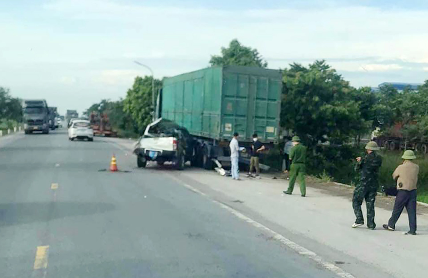 Tại hiện trường, xe bán tải bị hư hỏng phần đầu do đâm vào hông xe container, phía sau xe bán tải cũng bị biến dạng.