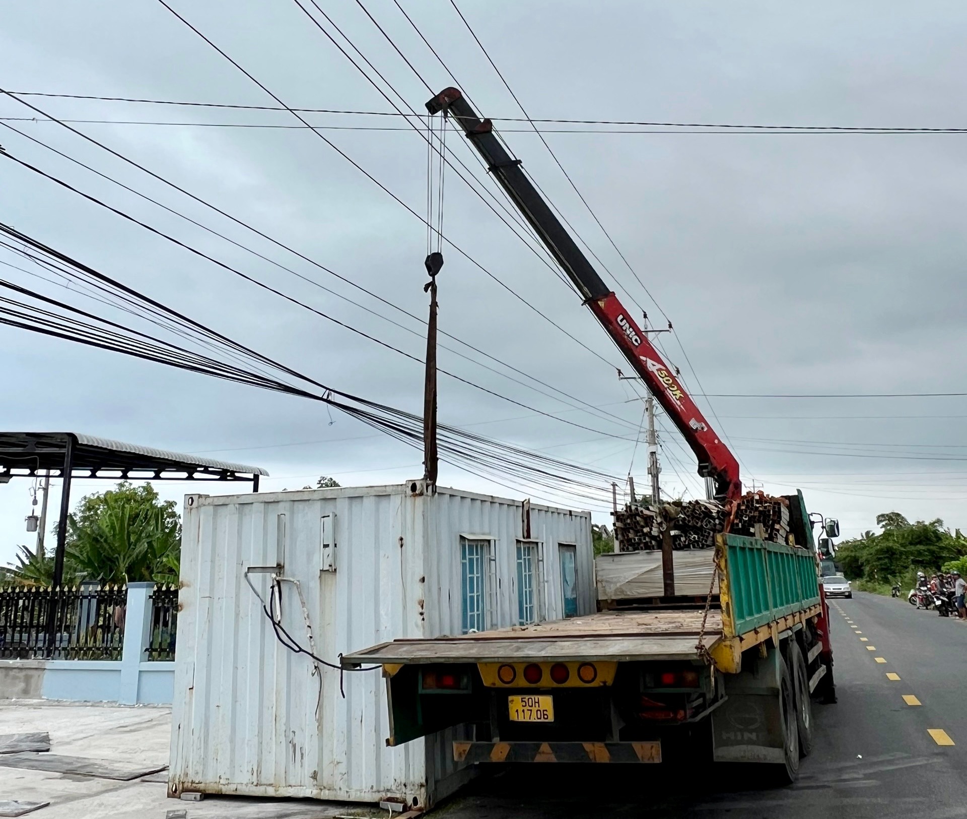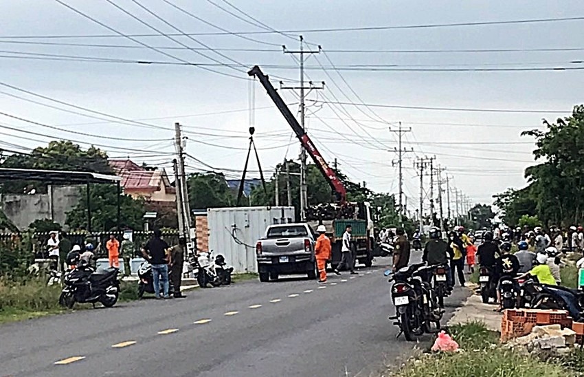 Thời điểm xảy ra tai nạn, xe cẩu đang cẩu thùng container trước nhà dân để làm nhà ở cho công nhân tại xã Tân Thành, huyện Hàm Thuận Nam, ngay dưới đường dây trung thế.