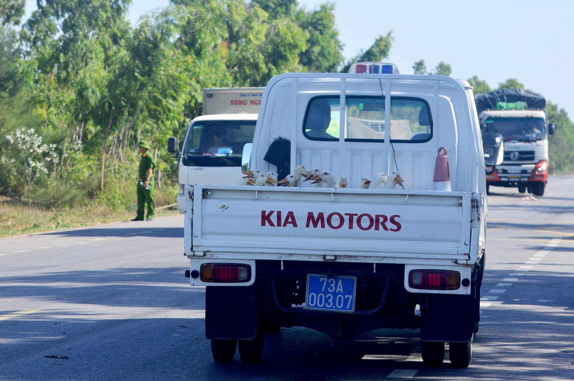 Đại úy Hoàng Thanh Bảo Duy, Đội trưởng đội CSGT Công an huyện Quảng Ninh cho biết: "Sau buổi giao ban, chúng tôi huy động toàn đội đến hiện trường giúp đỡ phía nhà xe để thu gom đàn vịt. Đội phải bố trí chốt trên một số đường nhánh, chặn những người đi xe máy có cầm theo số vịt còn sống để trả lại cho người gặp nạn".
