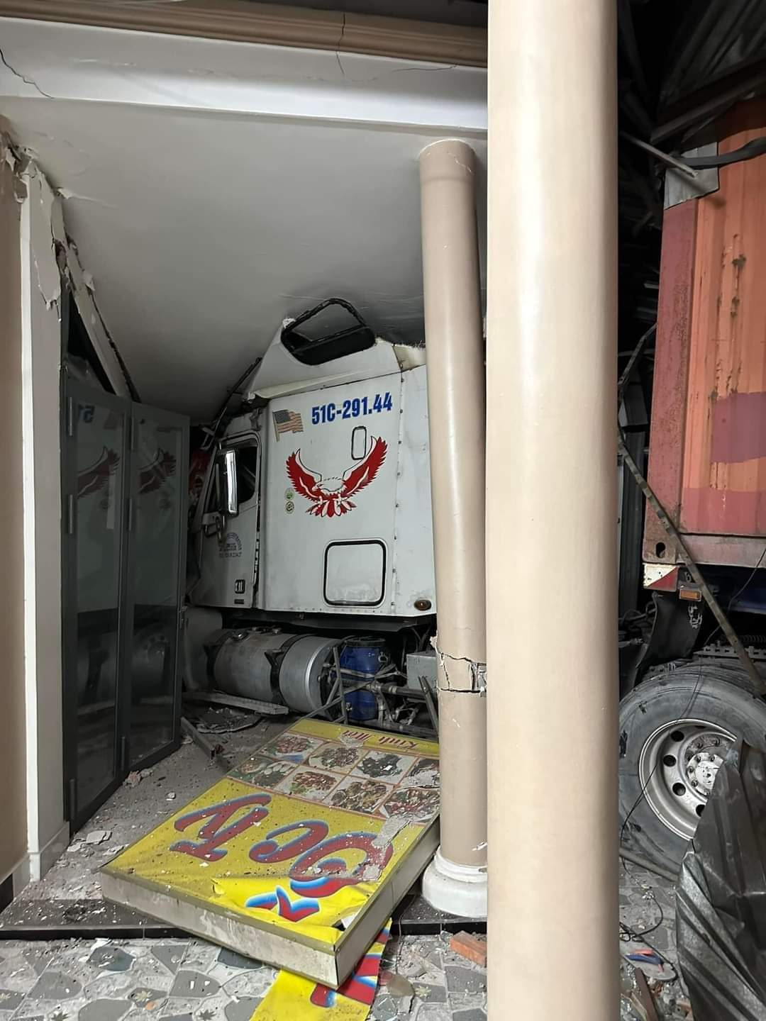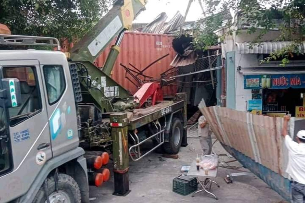 Tại hiện trường, phần đầu xe container tông vào cửa chính của một nhà dân và bị kẹt dưới mái hiên; mái che bằng bạt của một căn nhà bên cạnh bị tông sập; một số đồ đạc của hai căn nhà này bị hư hỏng.