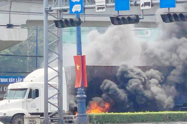 Khi cách ngã tư MK khoảng 20 m, lửa bùng lên từ điểm nối giữa đầu kéo và rơ-mooc, bén vào lốp xe cháy ngùn ngụt. Nam tài xế tung cửa cabin thoát ra ngoài hô hoán cầu cứu.
