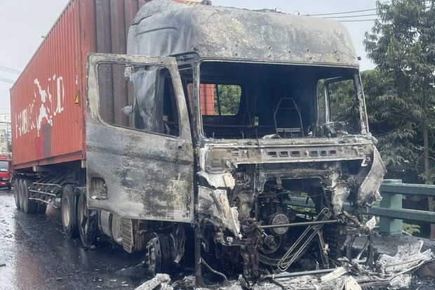 Vụ cháy không gây thiệt hại về người nhưng đã làm xe container bị cháy rụi phần cabin.