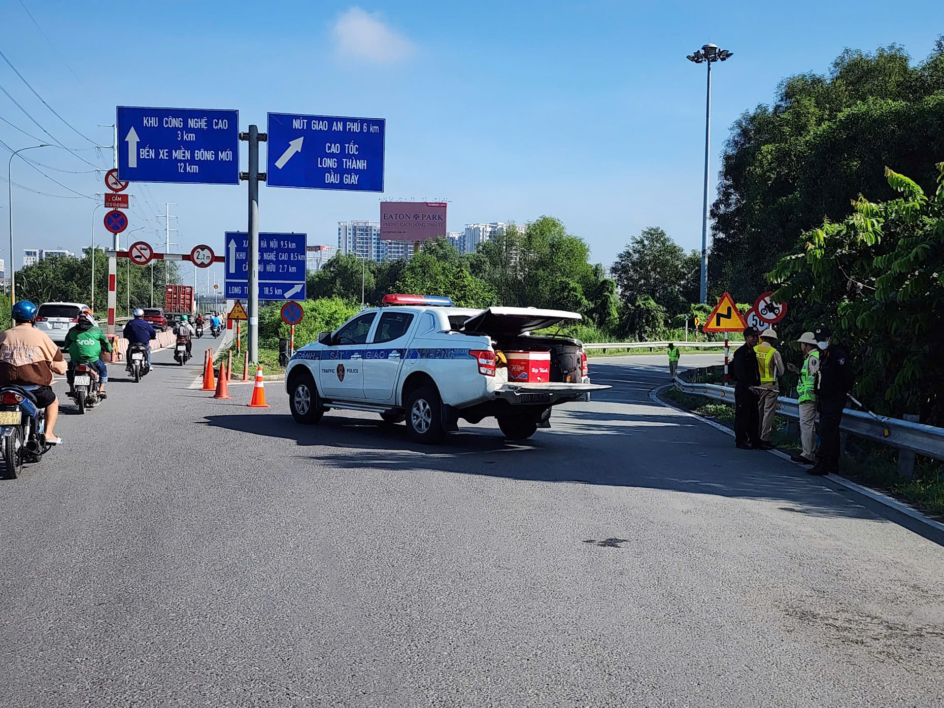 Trong khi đó, anh Tuấn (tài xế xe container) cho biết, khoảng 8h sáng nay, khu vực nút giao An Phú bị CSGT chốt chặn không cho phương tiện di chuyển vào đường dẫn.