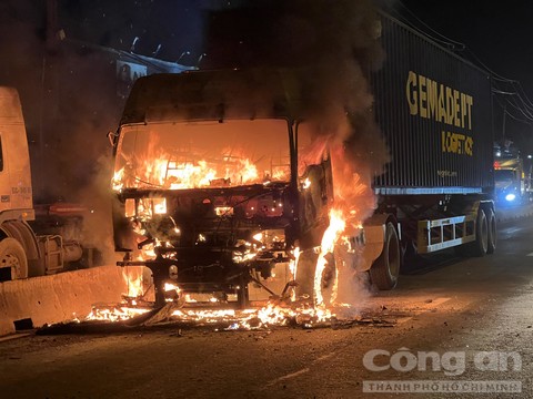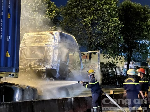 Tới gần 22 giờ tối 25-11, lực lượng chức năng vẫn đang xử lý hiện trường vụ xe container bốc cháy ngùn ngụt làm phần cabin bị thiêu rụi trên quốc lộ 1, đoạn qua TP.Thủ Đức, TPHCM.