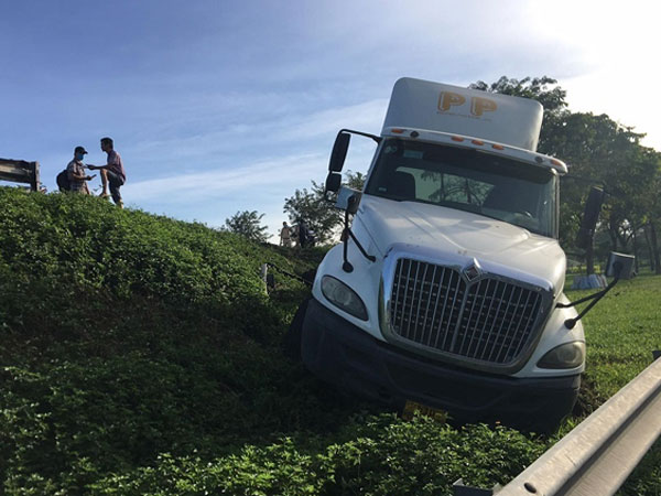 Sự việc khiến đầu xe container hư hỏng, nằm dưới hố cách mặt đường hơn 2m. Ngoài ra, hàng chục mét taluy bằng sắt cũng bị tông gãy, nhiều người đi đường 1 phen hú vía.