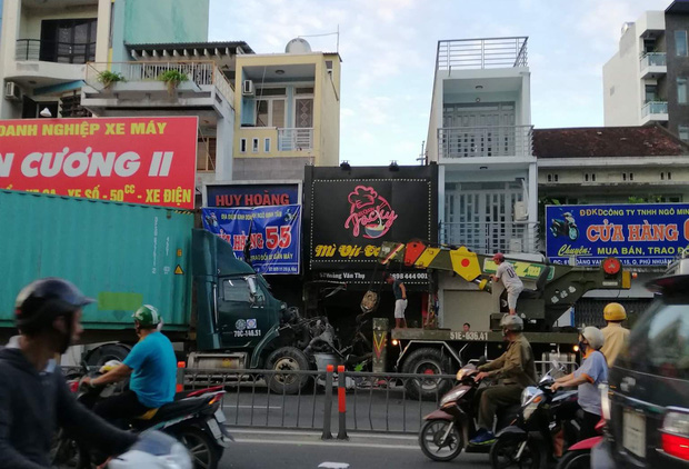 Khi vừa qua khỏi ngã tư Phú Nhuận khoảng 100m thì xe mất lái tông bay dải phân cách bằng sắt trên đường. Sau đó xe container lao sang đường đâm vào cửa hàng xe máy và quán ăn mì vịt.