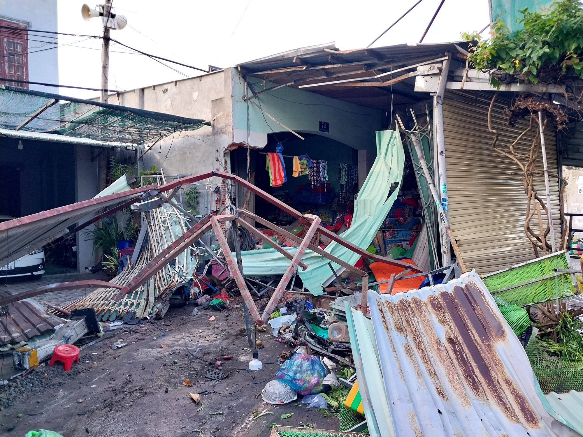 Tại hiện trường, hông căn nhà bị đổ sập, đồ gia dụng văng khắp nơi. Tôn, xà gồ, gạch nằm ngổn ngang. Đầu xe container bị móp méo, hư hỏng, kín chắn gió bị vỡ.