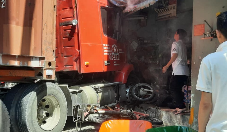 Khi xe chạy qua khỏi giao lộ Nguyễn Văn Quỳ- Đào Trí khoảng 100m, tài xế cho xe quay đầu dưới gầm cầu Phú Mỹ để di chuyển về cảng Rau Quả thì bất ngờ lao thẳng qua đường rồi đâm thẳng vào nhà dân bên đường thuộc phường Phú Thuận.
