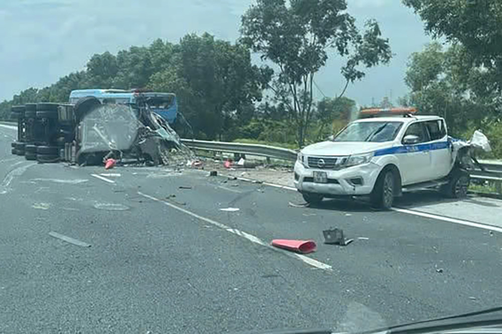 Cú va chạm khiến xe đầu kéo tiếp tục va chạm với xe tuần tra giao thông (thuộc Công ty quản lý đường cao tốc Hà Nội - Hải Phòng) mang biển số 29C- 496.XX, đang dừng đỗ để hỗ trợ ô tô gặp sự cố trên truyến.