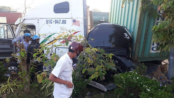 Sau va chạm, xe 4 chỗ kẹt giữa đầu kéo và rơmoóc của xe container, hư hỏng nặng. 2 người đàn ông và 1 phụ nữ trong xe 4 chỗ đã tử vong.