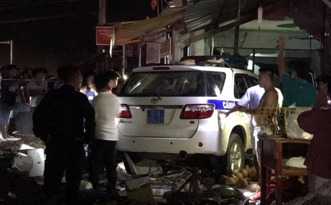 Chiếc xe ô tô 5 chỗ biển số xanh, bên ngoài có gắn phù hiệu của cảnh sát giao thông và đèn ưu tiên, do một người đàn ông khoảng 35-40 tuổi mặc thường phục điều kiển đã tông vào một người đi đường sau đó lao vào nhà dân.