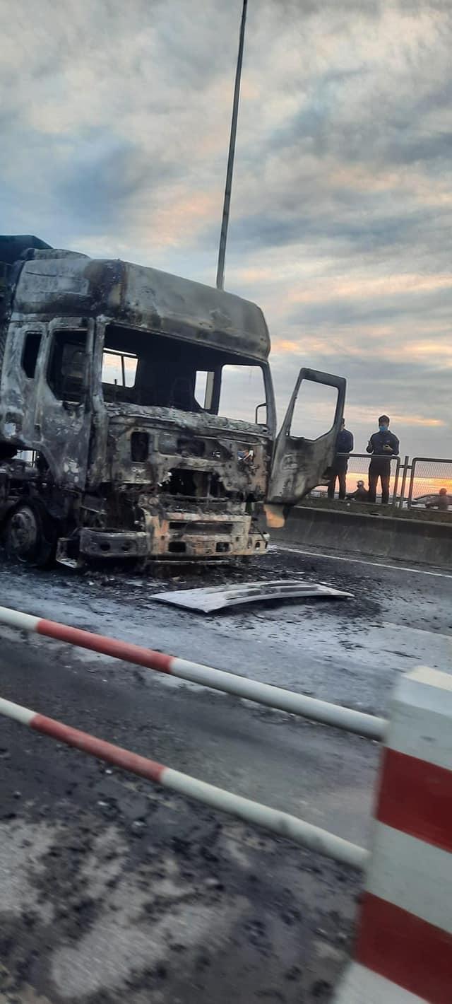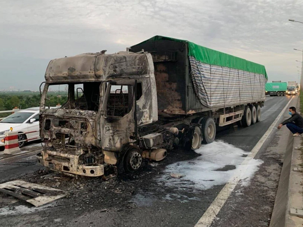 Bước đầu xác định xe đầu kéo mang BKS 29C-950.8x- 29R-076.4x chở thóc cháy rụi hết phần đầu, trên xe chỉ có 1 tài xế đã kịp thời thoát ra ngoài.