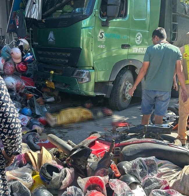 Thời điểm này, bà H. (SN 1962, cô giáo về hưu, trú thị trấn Quỳ Hợp) đang điều khiển xe máy sang đường, thì một chiếc xe đầu kéo lao lên tông phải. Chưa dừng lại ở đó, chiếc xe đầu kéo tiếp tục lao vào hàng loạt ki ốt bên quốc lộ.