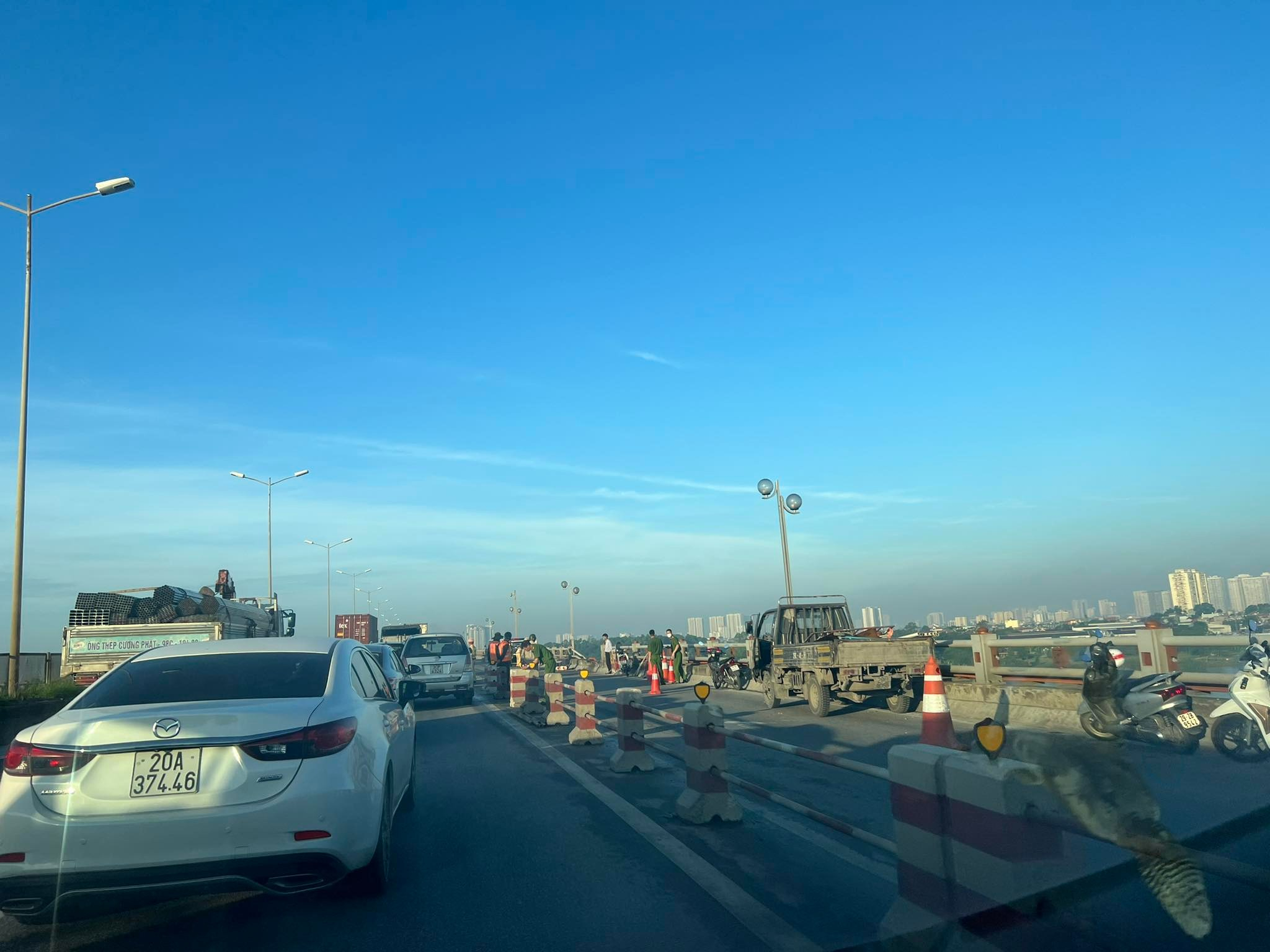 Đến đầu giờ sáng 30/8, các lực lượng công an vẫn đang tạm phong toả khu vực lan can bị đâm đổ, đồng thời phân luồng cho các phương tiện qua cầu Thanh Trì.
