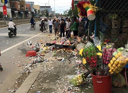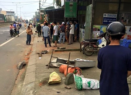 Tại hiện trường, đồ đạc bày bán trên lề đường vỡ tung tóe. Phần đầu “xe điên” biến dạng, xe máy của nạn nhân Hiếu bị tông nát. Hàng chục cảnh sát giao thông có mặt vãn hồi trật tự đồng thời quét dọn đồ đạc vỡ nằm la liệt trên quốc lộ.