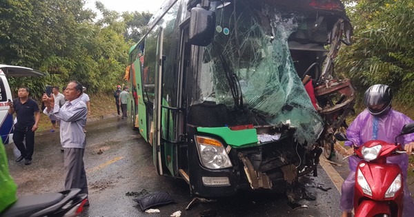Cú tông khiến hai ôtô hư hỏng nặng. Xe đầu kéo chắn ngang giữa đường. Hàng chục khách kêu cứu, hoảng loạn. Người đi đường đập kính giải cứu hành khách thoát ra ngoài.