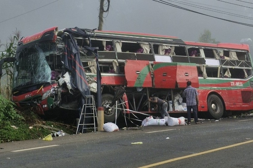 Vụ tai nạn khiến 2 tài xế xe khách, ô tô tải và 1 hành khách bị thương; 2 phương tiện bị hư hỏng, biến dạng.