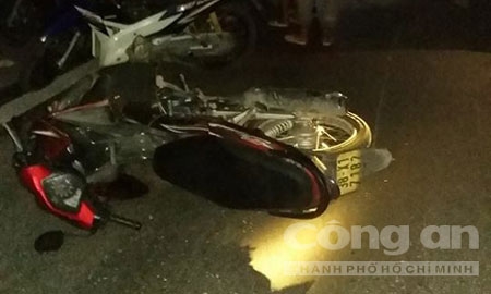 Cú tông mạnh khiến ô tô kéo lê xe máy khoảng 20 mét làm anh Chiến văng ra xa, đập đầu xuống đường bị thương trong tình trạng nguy kịch.