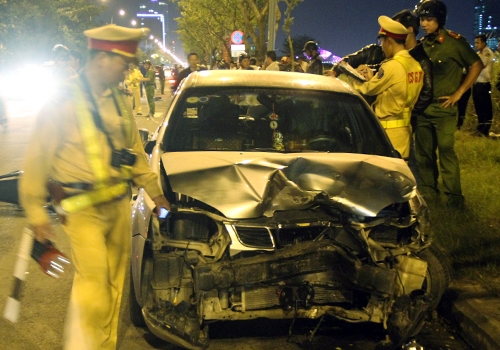 Sau khi tông vào xe máy do anh Nguyễn Văn Đường (28 tuổi, quê Quảng Bình) chở theo chị Dư Thị Phương Thảo (20 tuổi, trú Đà Nẵng), chiếc ôtô tiếp tục phóng đi, đâm tiếp vào hai xe máy khác mới dừng lại.