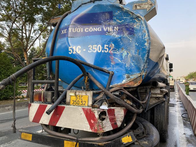 Tại hiện trường, đầu xe giường nằm biến dạng, kính chắn gió, cửa sổ vỡ tung. Ghế tài xế và hàng ghế phía sau hư hỏng. Xe tưới cây móp méo phần sau bồn chứa nước.