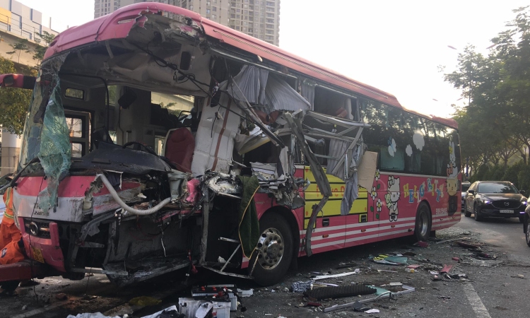 Khi cách cầu Sài Gòn khoảng 200 m, xe tông vào đuôi ôtô bồn đang tưới cây của Công ty TNHH MTV dịch vụ hạ tầng. Cú đâm khiến xe bị vỡ nát một phần, tài xế Ty chấn thương sọ não, hai khách gãy vai trái, chấn thương đầu gối.