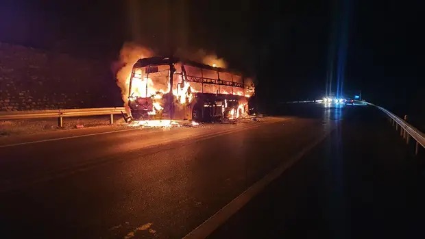 Đến 21h, đám cháy được dập tắt, nhưng xe khách bị cháy trơ khung, hư hỏng hoàn toàn, may mắn không thiệt hại về người.